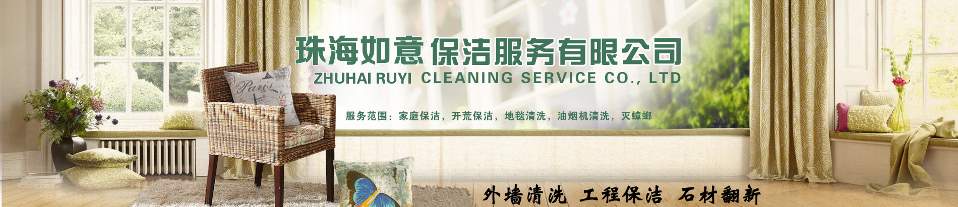 珠海市如意清潔主營:外墻清洗、地毯清洗、石材護理翻新、企業(yè)保潔、開荒清潔、屋面防水、油煙管道清洗。家庭保潔,物業(yè)保潔,小區物業(yè)保潔,樓盤開荒,沙發(fā)清潔,地板打蠟,(建筑、汽車玻璃貼膜)。